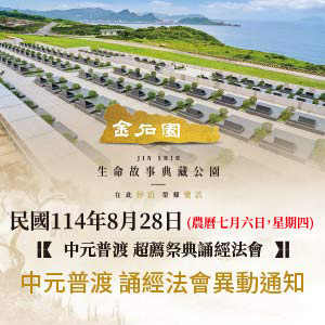 中元禮讚先人乃存世大德表達追思崇敬先人之神聖禮儀,114年中元普渡超薦祭典誦經法會,茲訂於8月28日(農曆七月六日)舉辦,本次法會仍由本公司依科儀備妥相關祭品,並代表統一超薦以示敬重,惟不開放報名功德蓮位、功德主蓮位,亦不開放參與現場誦經,法會實況將採線上段落直播方式,請加入臉書(FACEBOOK)金石園金石緣粉絲專頁,造成不便之處,敬請見諒!也感謝各位一直以來對於本公司的支持與愛護。
